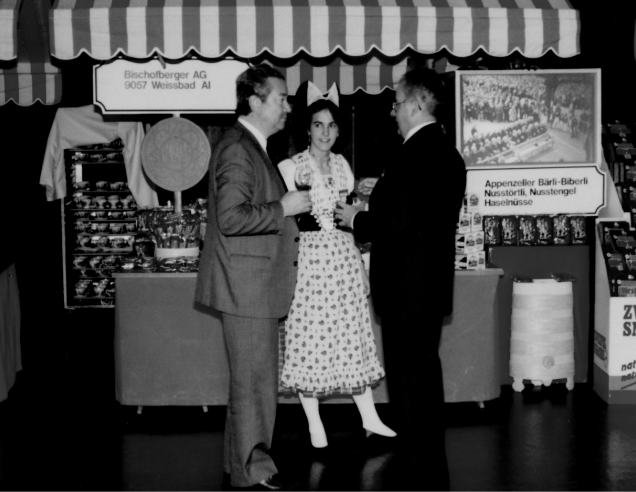 Messestand 1978 mit Josef Bischofberger, Tochter Karin Goldener-Bischofberger und Hansheri Zweifel (v.r.nl.)