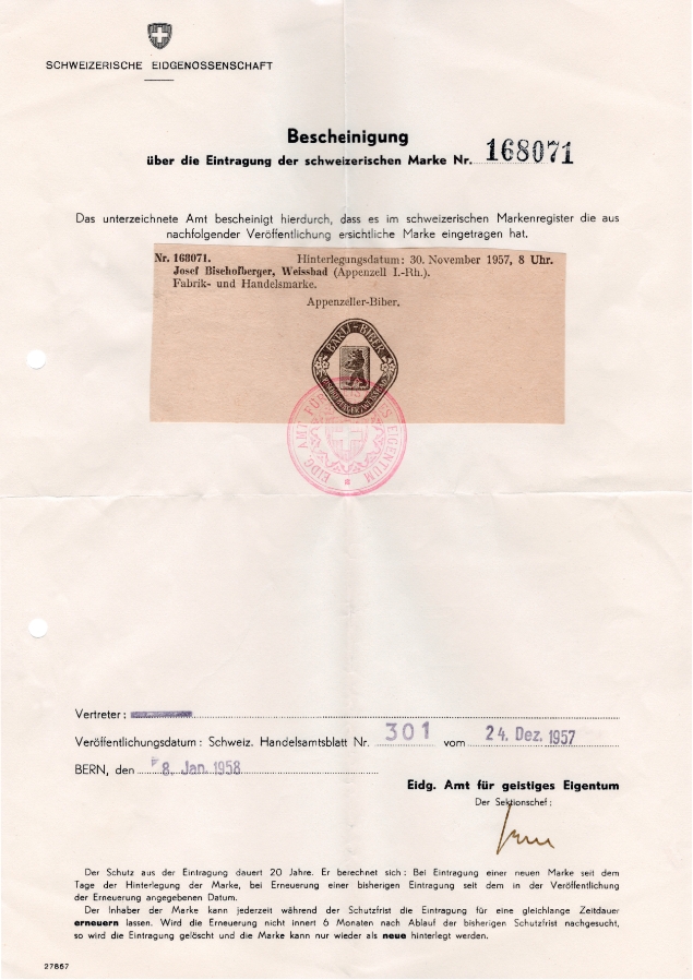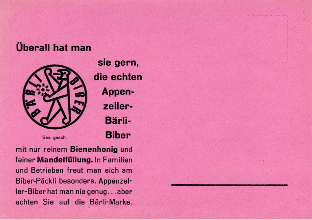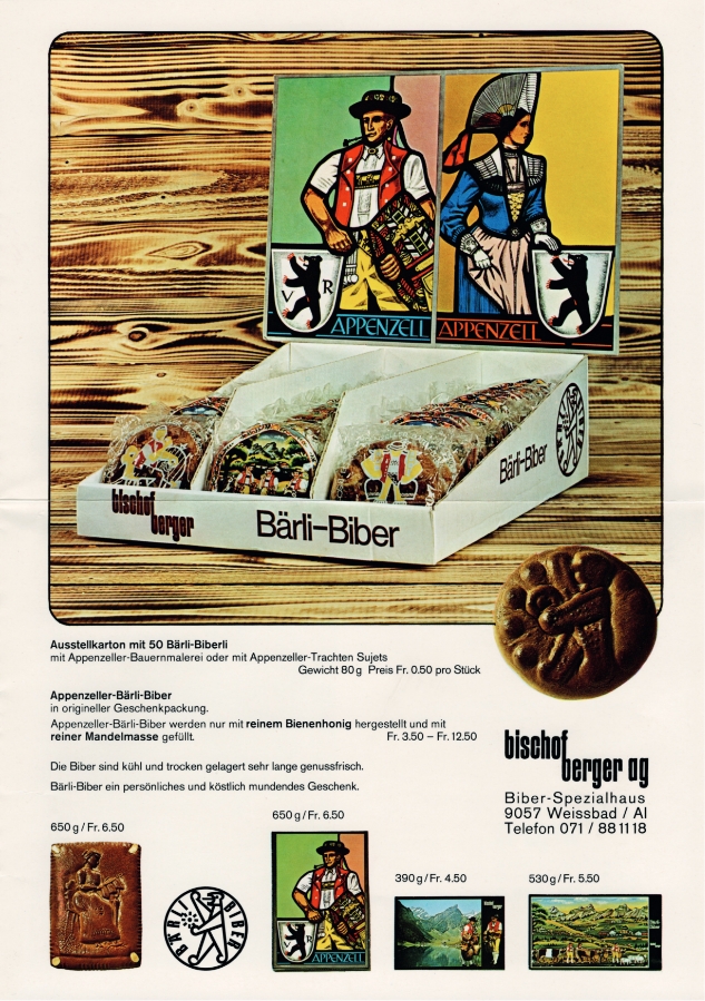 Bereits 1957 erkannte Josef Bischofberger den Wert einer registrierten Marke und liess «Bärli-Biber» beim Eidgenössischen Amt für ­geistiges Eigentum eintragen. Der Markenname sollte auch auf das Produkt geprägt werden. 1960 erhielt «Bärli-Biber» daher ein neues, bärenstarkes Logo. Das Wappentier von Appenzell ist der honigliebende Bär.