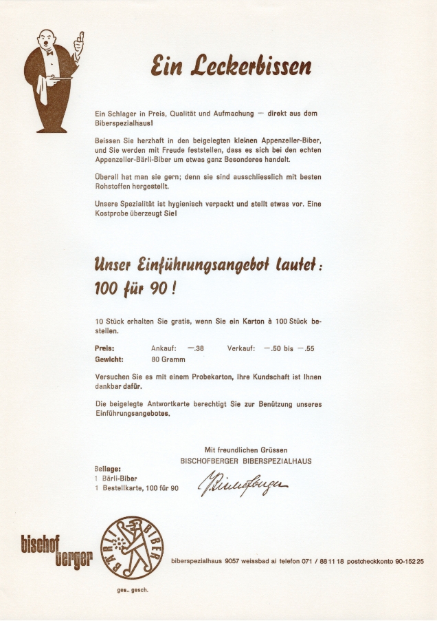 Brief für Kundschaft, dass die Bärli-Biber neue Verpackungen erhalten haben, 1965