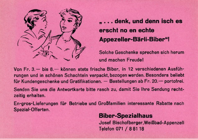 Josef Bischofberger (*1935) war vom Appenzeller Biber früh begeistert und nutzte den Militärdienst, um das Gebäck unter die Leute zu bringen. Josef erzählt: «Ich hatte während meiner Rekrutenzeit in Chur meistens einen kleinen Vorrat von unseren Biberli dabei und liess die Leute ­probieren. Die Bestellungen häuften sich und ich konnte nebst der Kaserne bald auch Restaurants beliefern.»